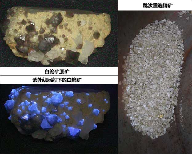 下圖是一組粗粒嵌布的白鎢礦的圖片,左上圖為原礦石圖片,左下圖為紫外線照射下的白鎢礦圖片(紫外線照射下可以看到明顯的白鎢礦結(jié)晶體),右圖是利用跳汰機(jī)重選獲得的白鎢礦精礦。