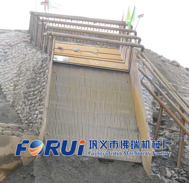 砂金選礦溜篩的作用主要是通過簡單高效的篩分方法把砂金礦中的大塊廢石,鵝卵石等不含金的廢石預(yù)先拋棄,提高整個選礦流程的處理量和有效工作率。砂金選礦溜篩通常由圓鋼焊接而成,與地面有特殊的角度,溜篩上方還要布置大量的沖洗水管,沖洗水管的作用就是通過洗礦將泥土粘結(jié)成塊的物料碎解,避免因金粒被包裹在泥團中而流失。